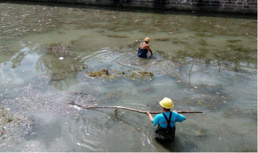 清潔工人在高溫惡劣環境中清理水面垃圾