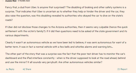 新戰(zhàn)略低速無(wú)人駕駛?cè)襟w獲悉,雖然事情已經(jīng)過(guò)去了5年,自動(dòng)駕駛技術(shù)在不斷提升。但從外網(wǎng)評(píng)論來(lái)看,大家對(duì)自動(dòng)駕駛出行服務(wù)的安全性、穩(wěn)定性還是帶有很大的問(wèn)號(hào)。