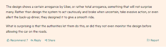 “這一設(shè)計(jì)顯示出 Uber 的某種傲慢,或者說(shuō)是完全的傲慢,很多人對(duì)此并不感到意外。他們沒(méi)有設(shè)計(jì)出謹(jǐn)慎行事的系統(tǒng),在不確定的情況下剎車、采取規(guī)避措施,甚至提醒后備司機(jī),而是設(shè)計(jì)出了一個(gè)平穩(wěn)的駕駛系統(tǒng)......”