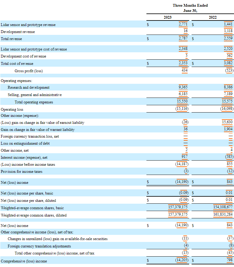 Luminar及其子公司2023Q2合并經(jīng)營報表(以千美元計,股份和每股數(shù)據(jù)除外)