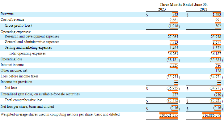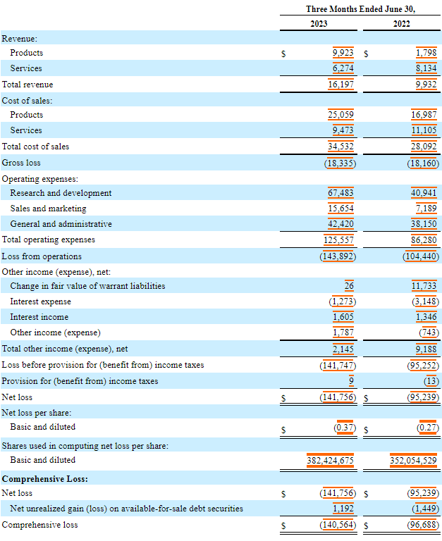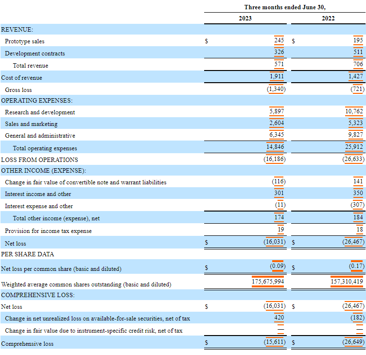 Aeva 2023Q2綜合收益及虧損報表(以千美元計,股份和每股數(shù)據(jù)除外)