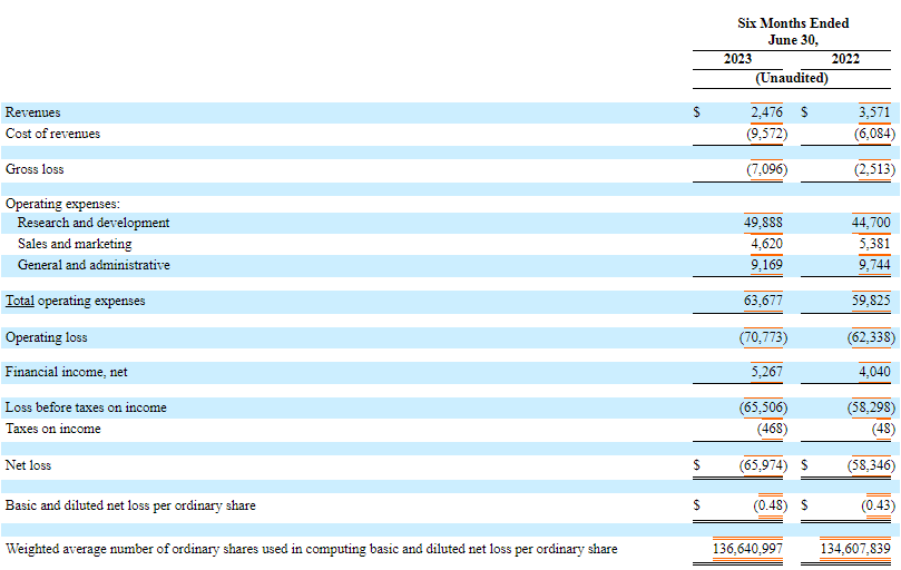 Innoviz直接公布了上半年公司未經(jīng)審計的財報。結(jié)合公司今年第一季度的財報數(shù)據(jù)分析,Innoviz第二季度收入146.6萬美元,收入成本為463.1萬美元,上半年總體毛損達(dá)709.6萬美元。