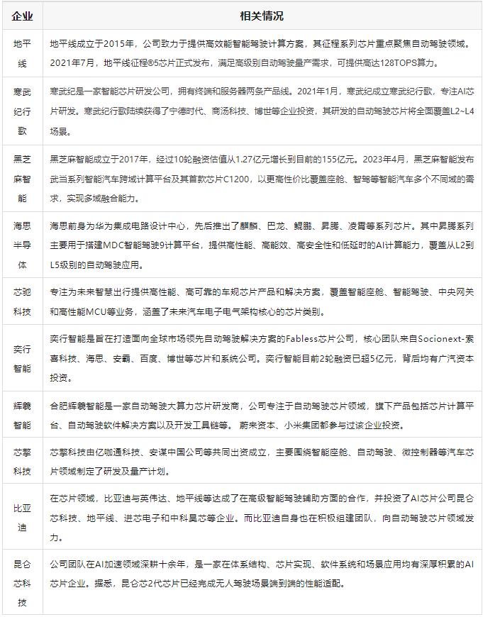 國內(nèi)部分自動駕駛芯片企業(yè)