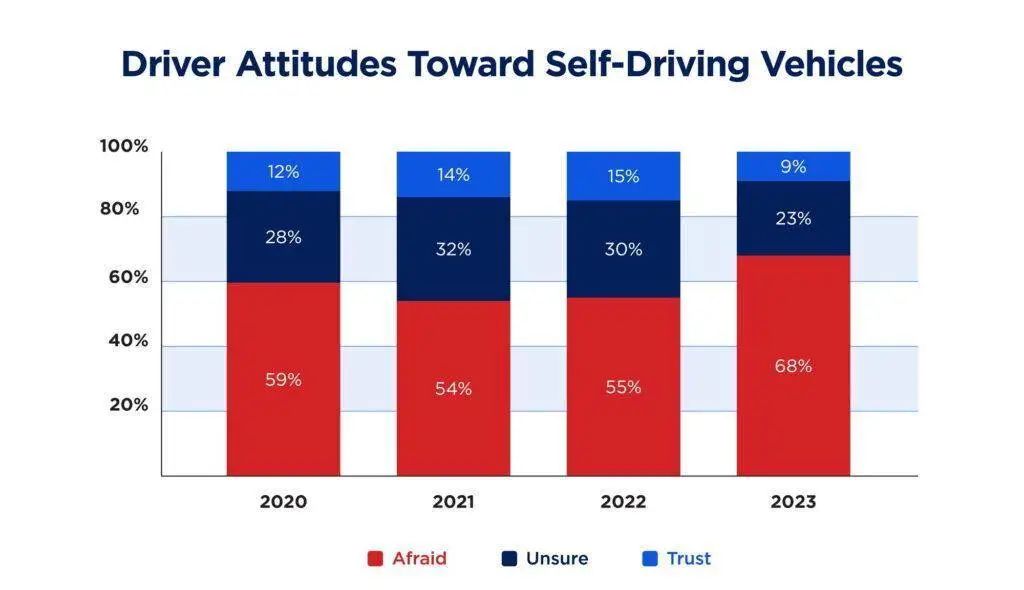 美國(guó)汽車協(xié)會(huì)AAA發(fā)布的一項(xiàng)調(diào)查顯示,美國(guó)人開始害怕自動(dòng)駕駛汽車,在調(diào)查的大約1000人中,68%的受訪者表示他們害怕駕駛自動(dòng)駕駛汽車,比去年的研究增加了55%,這13%的差異是自2020年以來(lái)的最大增幅。