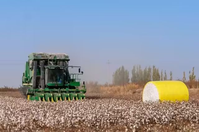 在棉花播種階段,裝配有農機自駕儀的播種機一鍵啟動,可實現精準、高效的自動化作業。此外,還有除草農業無人機,給棉花澆水施肥智能灌溉系統,棉花采收采棉打包一體機等。