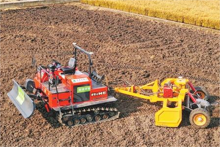 在農場第六管理區,新引進的履帶式拖拉機等農用機械完成無人化改裝,實現遙控啟動、精度行走、智能作業、機具回庫等環節的無人化操控,大大節省人力成本,提升作業標準和效率。