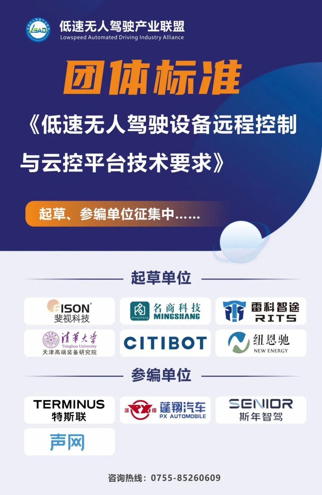為推動形成遠程自動駕駛技術規范,低速無人駕駛產業聯盟正在組織制定《低速無人駕駛設備遠程控制與云控平臺技術要求》(擬定名)。該標準由長沙斐視科技有限公司、名商科技有限公司、理工雷科智途(北京)科技有限公司、清華大學天津高端裝備研究院、福龍馬城服機器人科技有限公司、湖南紐恩馳新能源車輛有限公司起草,特斯聯科技集團、 山東蓬翔汽車有限公司、北京斯年智駕科技有限公司、上海聲網科技有限公司參編。