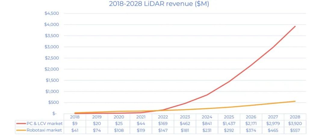 導語:全球車端激光雷達的需求仍在迅速增長,市場預計將從2022年的3億美元左右增長到2028年的45億美元左右。