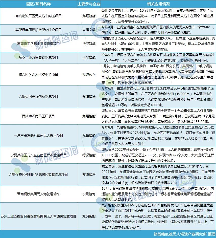據新戰略低速無人駕駛產業研究所了解,園區物流無人駕駛的應用場景主要是在工業園、物流園、保稅區、制造工廠等。目前,領先布局的一些企業已經開始嘗到了無人駕駛帶來的降本增效“甜頭”,加速了更多項目落地應用。