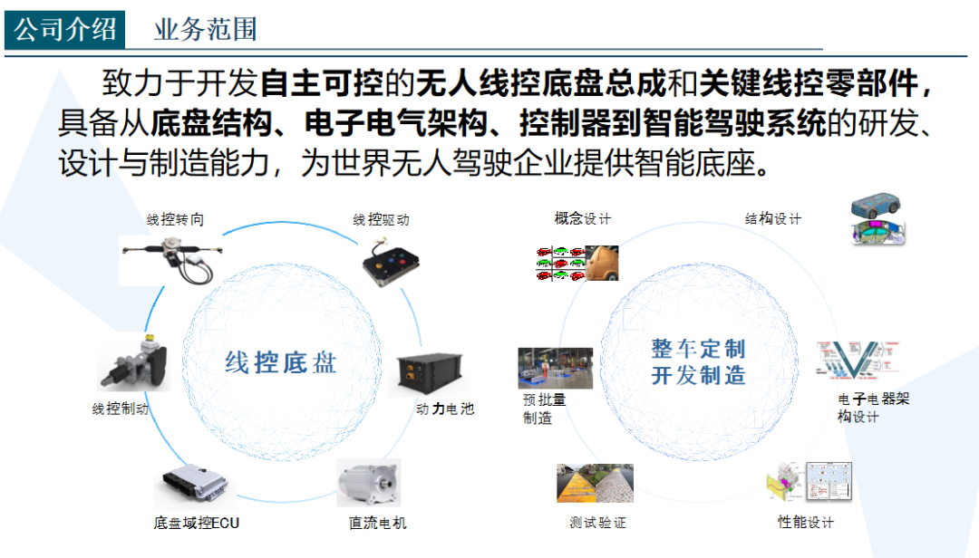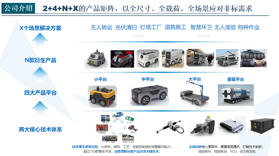 MARS事業(yè)部目前共有150人,其中博士3人,碩士10余人。專注于無人線控底盤和關(guān)鍵零部件的研發(fā),涉及線控零件、底盤、控制等多個領(lǐng)域,具備從底盤、結(jié)構(gòu)、到控制器的研發(fā)與設(shè)計能力。目前產(chǎn)品已覆蓋大中小、重載全尺寸,廣泛用于工業(yè)場景智能底座、無人售賣、無人物流、無人環(huán)衛(wèi)、無人配送、智慧機場等場景。