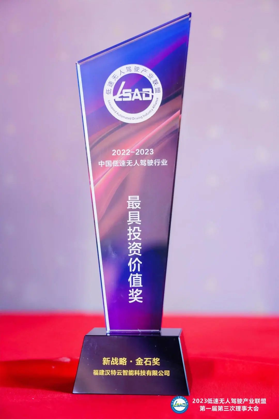 “2022-2023低速無人駕駛行業雙年度評選”活動特設創新產品獎、最佳供應鏈品質獎、最具投資價值獎、最具成長力價值獎。本屆評選活動中,福建漢特云智能科技有限公司(簡稱“漢特云智能”)榮獲“最具投資價值獎”。