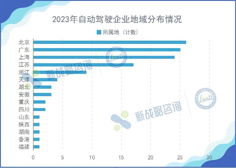 從企業(yè)地域分布看,2023年仍是北京、上海、廣東三大省市的自動(dòng)駕駛企業(yè)吸金能力最強(qiáng)。北京市以26家企業(yè)、融資30起繼續(xù)保持首位,廣東省以25家企業(yè)、融資30起次之,上海市以24家企業(yè)、融資27起位居第三。