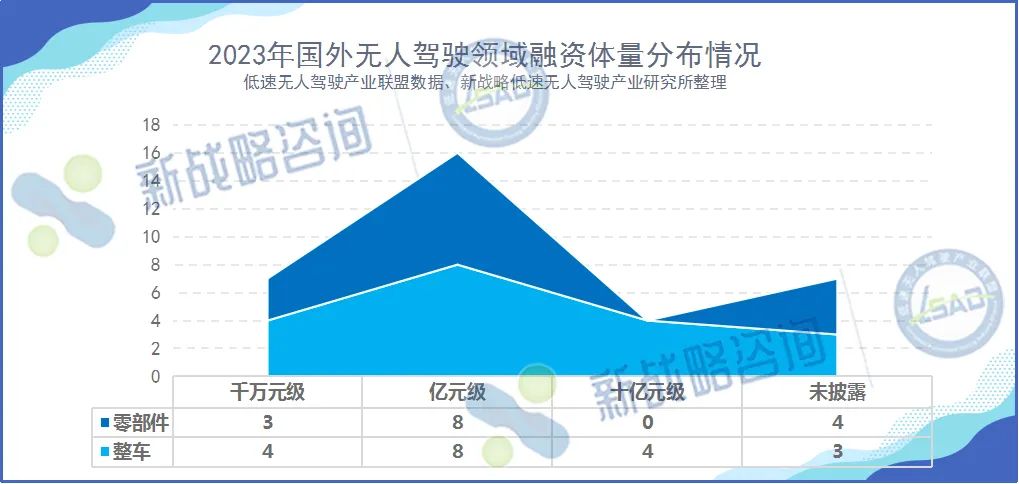 總體而言,相較2022年國外披露的近50起、約合人民幣近530億元(包括IPO、并購),2023年國外自動駕駛領域的融資活躍度也明顯下降。資本寒冬之下,國外多家自動駕駛企業已在去年宣布退局,這也留給行業更多關于場景和商業模式選擇的思考。(更詳細了解2023年國外低速無人駕駛產業投資變化、市場趨勢,請關注低速無人駕駛產業聯盟、新戰略低速無人駕駛產業研究所即將發布的年度研究報告)