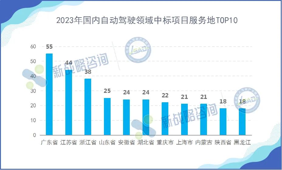 2023年國內自動駕駛領域中標項目服務地TOP10(據公開信息,低速無人駕駛產業研究所不完全統計數據整理)