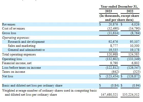 綜合來看,2023 年 Innoviz 整體凈虧損超 1.23 億美元,同比 2022 年虧損減少 341.8 萬美元;平均每股凈虧損 0.84 美元。