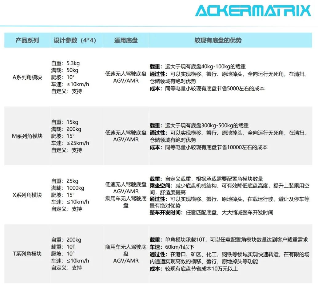 目前阿克曼矩陣已針對無人配送、末端快遞物流、室內外安防機器人、移動儲能、工業轉運等多個領域開發出了A系列、M系列、X系列、T系列角模塊,載重覆蓋50kg—10T,遠大于現有同等重量底盤載重。且成本較現有底盤明顯下降,最高可節約成本10萬元以上。