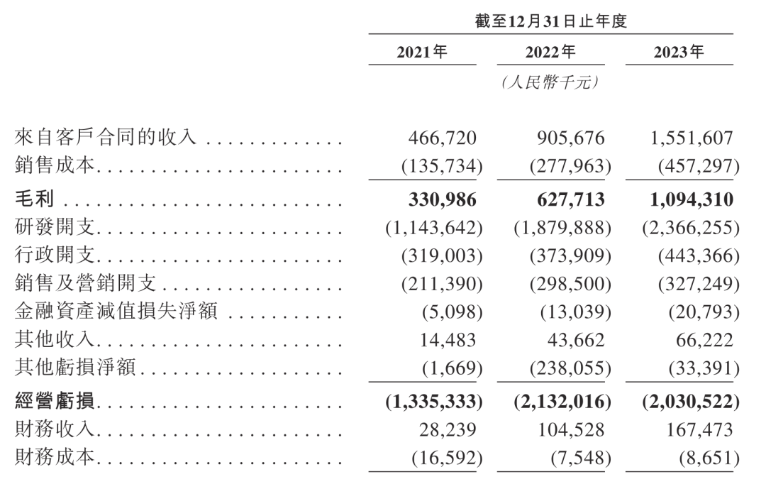 招股書顯示,2021年、2022年及2023年,公司收入大幅增長,分別為4.667億元、9.057億元及15.516億元,2022年及2023年收入增長率分別為94.1%及71.3%。2021 年至 2023 年的復合年增長率 (CAGR) 為 82.3%。