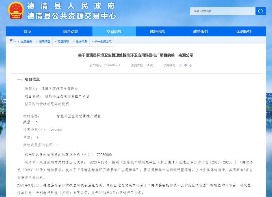 4 月 7 日,德清縣公布了一則“關于德清縣環境衛生管理處智能環衛應用場景推廣項目的單一來源公示”消息,項目預算總金額 7203 萬元,服務期 3 年,云創智行科技(蘇州)有限公司被擬定為供應商。值得一提的是,該項目要求揭榜單位總部搬遷至德清,上市主體落地德清。