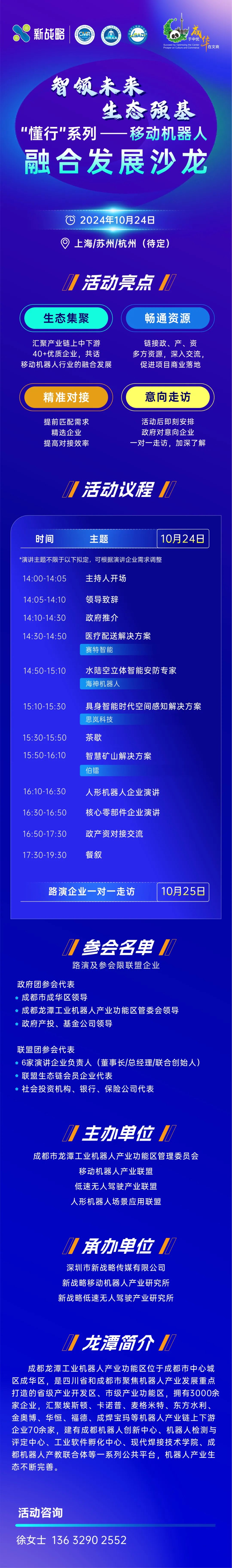10月24日,低速無人駕駛產業聯盟與成都龍潭工業機器人產業功能區將聯合主辦“懂行”系列——移動機器人融合發展沙龍,促進聯盟企業與功能區的深入合作交流,加速場景商業化落地,歡迎廣大聯盟企業報名參會。
