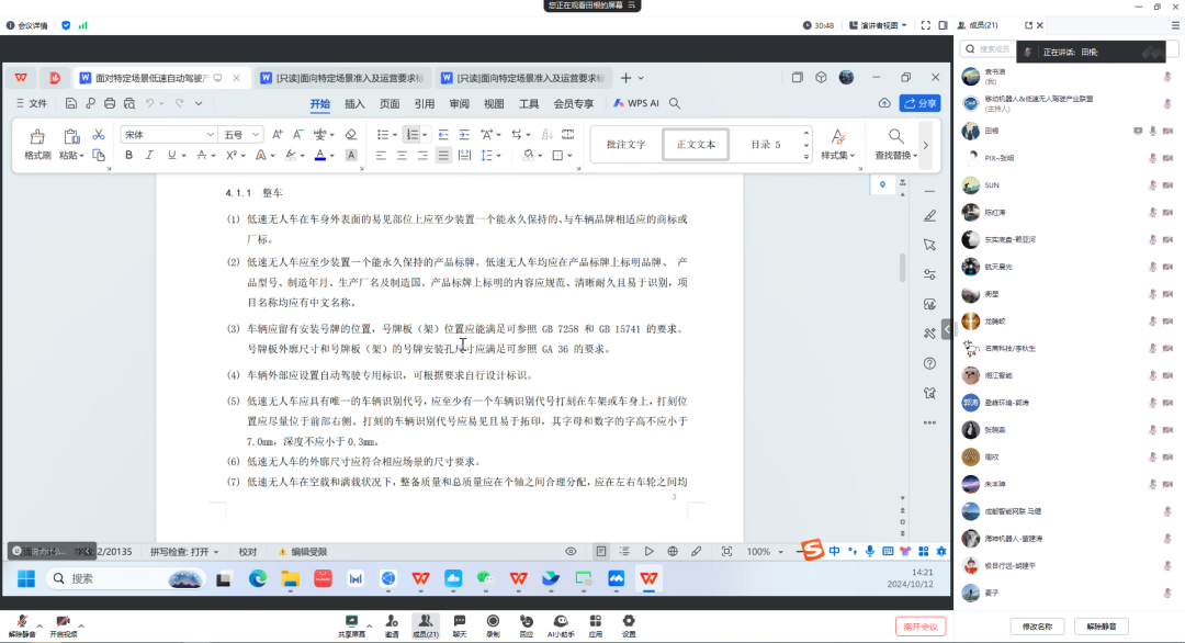 10月12日下午,低速無人駕駛產業聯盟標準化技術委員會組織召開“2024年團體標準草案第三次研討會”。聯盟標委會專家代表以及標準參與單位有關負責人參加會議。