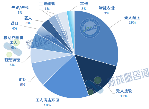 在整理的第三季度新增落地中,無人配送車的應用項目占比排第一,共有43個新增落地項目,以九識智能、新石器為代表的無人配送企業在本季度獲得包括山東青島、陜西漢中、安徽合肥、浙江嘉興等多地的首批“上路”牌照,這也是推動無人配送車規模化應用的關鍵。(推薦閱讀:超250輛!又一城開啟無人車大規模落地)