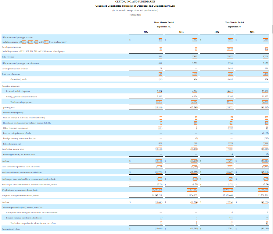 Cepton 2024 Q3 經營業績報表(來源:美國證券交易委員會,單位以千計,份額和每股數據除外)
