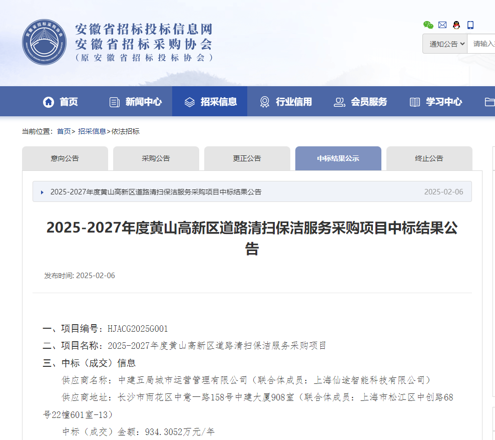 2月6日,仙途智能與中建五局城市運(yùn)營管理有限公司成立的聯(lián)合體中標(biāo)“2025-2027年度黃山高新區(qū)道路清掃保潔服務(wù)采購項目”,該項目服務(wù)費(fèi)約2803萬元,服務(wù)年限3年。