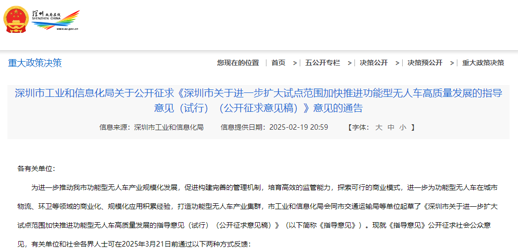 2月19日消息,為進一步推動深圳市功能型無人車產業規模化發展,《深圳市關于進一步擴大試點范圍加快推進功能型無人車高質量發展的指導意見(試行)(公開征求意見稿)》公開征求意見。其中提到,統籌推進,試點先行。發揮市級層面統籌協調作用,整體推進功能型無人車運營試點管理工作。