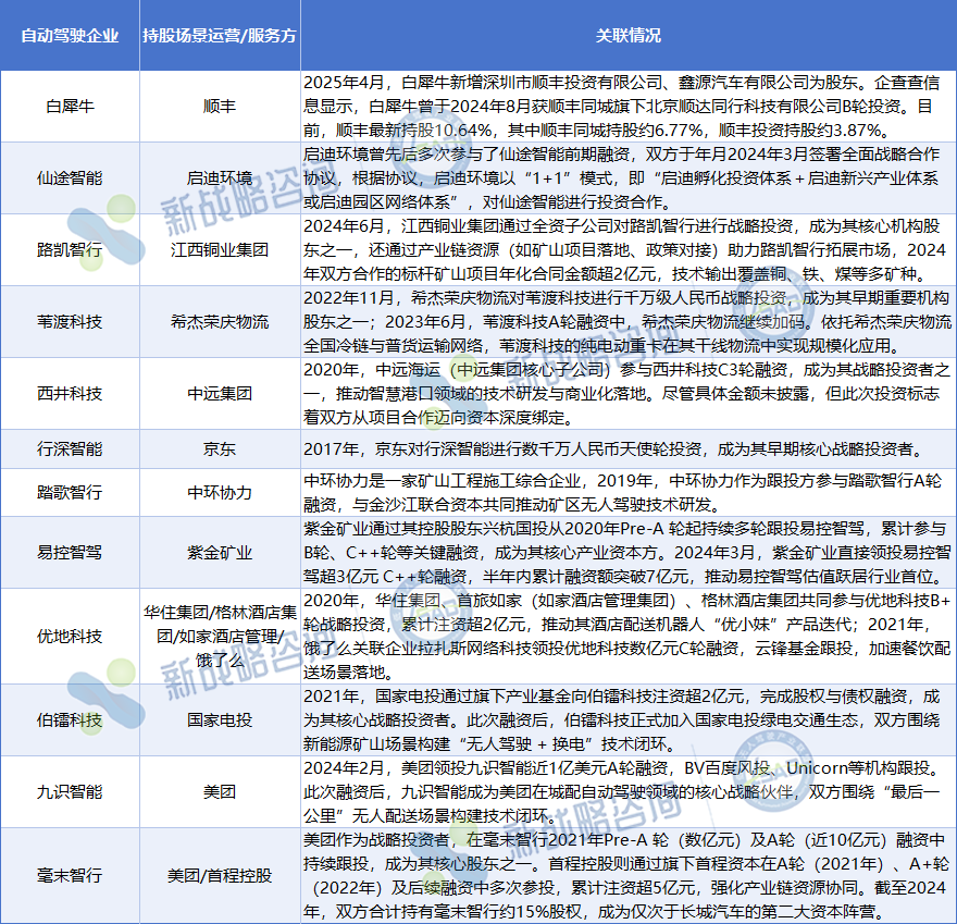 場景運營商們往往選擇以資本形式加持自動駕駛科技企業、實現資本深度綁定后,更有利于雙方深入開展項目合作。