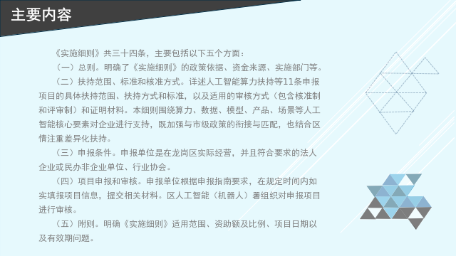 (一)扶持范圍:支持企業(yè)在龍崗區(qū)建設具有行業(yè)引領的人工智能示范場景項目。