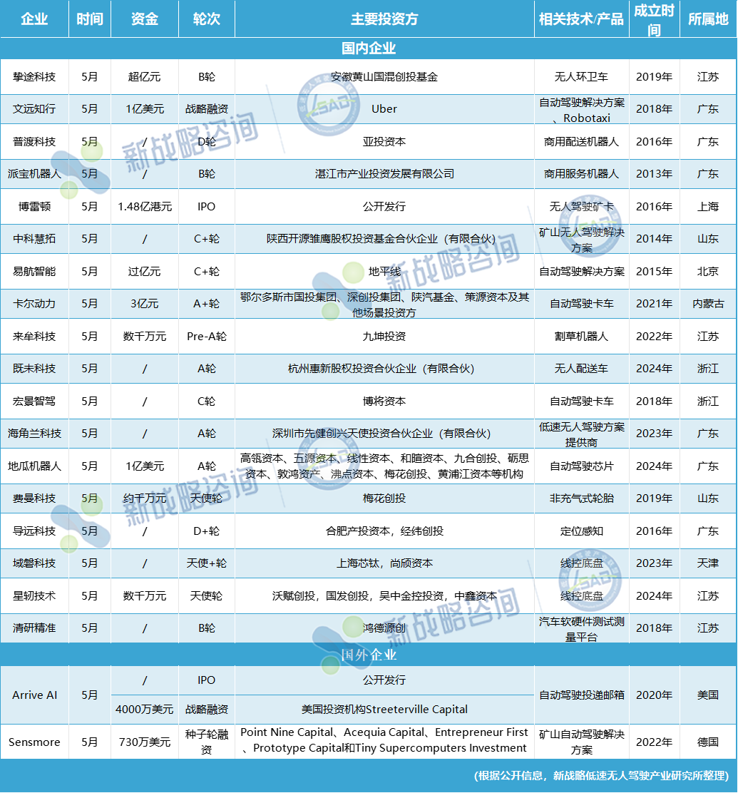 據新戰略低速無人駕駛產業研究所不完全統計,2025年5月,國內外自動駕駛領域公開20起重要投融資事件,披露的融資總金額超21億元(匯率按1美元≈7.23元估算)。