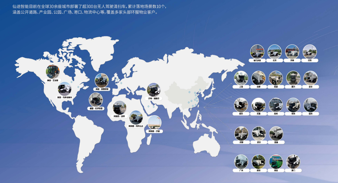 在商業(yè)化落地速度上,仙途智能已在全球30余座城市成功部署無(wú)人駕駛車,相繼在市政道路、機(jī)場(chǎng)港口、工廠園區(qū)、旅游景點(diǎn)等多樣化場(chǎng)景落地,實(shí)現(xiàn)開放-半封閉-封閉的室外場(chǎng)景全覆蓋,建立起了全球化商業(yè)版圖。