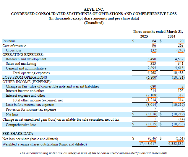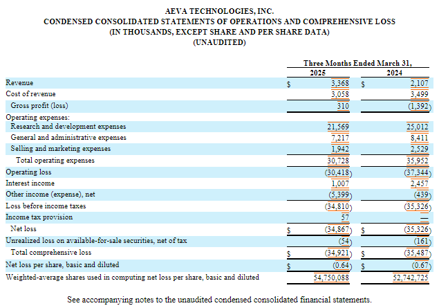 如AEye公布的2025年第一季度財報顯示,其季度營收僅6.4萬美元,而運營支出676.8萬美元,凈虧損達到了801.6萬美元。