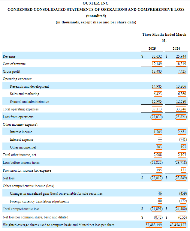 相比之下,Ouster的一季度營收還達到了3263.2萬美元,同比增長近26%。運營費用支出3731.3萬美元,其中研發費用支出占比40%。綜合各項,Ouster今年一季度也虧損了超2200萬美元。