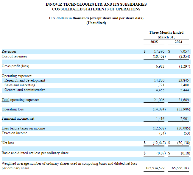 Innoviz今年一季度營收1739萬美元,同比增長了146.4%。雖然減去收入成本有所結余,但綜合運營費用及其他虧損,公司一季度還是凈虧損1264.2萬美元。
