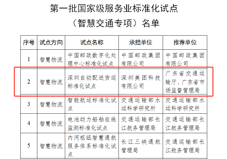 《國家市場監督管理總局辦公廳關于公布第一批國家級服務業標準化試點(智慧交通專項)名單的通知》,深圳已被列入牽頭自動配送貨運標準化試點城市。