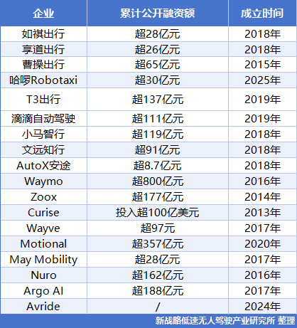 自2015年以來,全球范圍內的Robotaxi企業在資本市場上幾乎沒有一刻“安靜”,融資總額動輒上億美元,甚至有企業累計投入已突破百億美金大關。下面這張表,可以清晰勾勒出這一賽道過去十年來的“吸金地圖”與“燒錢軌跡”。