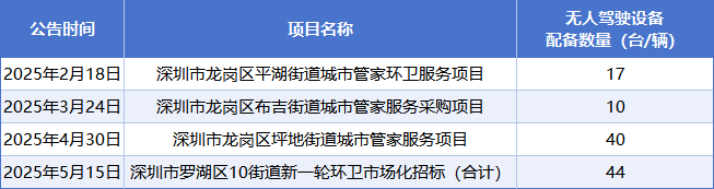 2月份開標(biāo)的深圳市龍崗區(qū)平湖街道城市管家環(huán)衛(wèi)服務(wù)項(xiàng)目,要求配備智能環(huán)衛(wèi)設(shè)備17臺(tái)(輛);3月份開標(biāo)的深圳市龍崗區(qū)布吉街道城市管家項(xiàng)目,要求配備智能環(huán)衛(wèi)設(shè)備10臺(tái)(輛);4月份開標(biāo)的深圳市龍崗區(qū)坪地街道城市管家項(xiàng)目,要求配備智能環(huán)衛(wèi)小型機(jī)掃車40臺(tái)(輛)。5月份,隨著清水河街道環(huán)衛(wèi)一體化項(xiàng)目結(jié)果公布,深圳市羅湖區(qū)10街道新一輪環(huán)衛(wèi)市場(chǎng)化招標(biāo)結(jié)果全部出爐,本輪次顯示羅湖區(qū)10個(gè)街道一體化項(xiàng)目共需配置無人智能環(huán)衛(wèi)設(shè)備44臺(tái)(輛)。