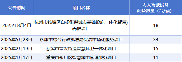 今年以來多個(gè)環(huán)衛(wèi)項(xiàng)目開始要求規(guī)?;斗艧o人化智能設(shè)備,行業(yè)趨勢(shì)的變化不僅僅反應(yīng)在個(gè)別企業(yè)身上,以深圳為代表的城市也在今年開啟了無人駕駛環(huán)衛(wèi)設(shè)備規(guī)?;哳l投放,僅6月份之前就投入超百臺(tái)無人化設(shè)備,單個(gè)項(xiàng)目最高投入40臺(tái),具體如下: