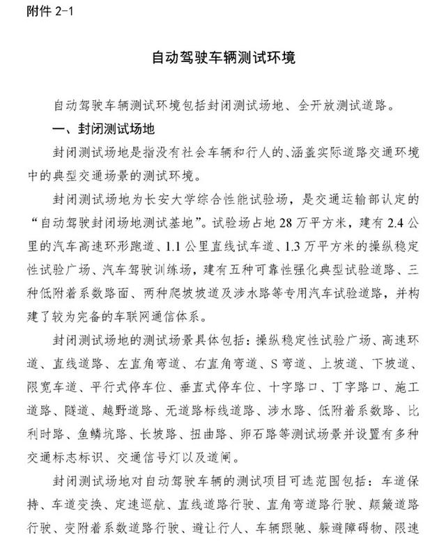 (四)自動駕駛車輛測試環境包括封閉測試場地和全開放測試道路。封閉測試場地是指沒有社會車輛和行人的、涵蓋實際道路交通環境中的典型交通場景的測試環境。全開放測試道路是指在限定區域內、具有自然社會車流和人流的復雜交通場景的測試環境。測試環境涵蓋高速公路、城市道路和鄉村道路等多種行駛道路的典型道路場景,具體測試場景和測試項目詳見附件。