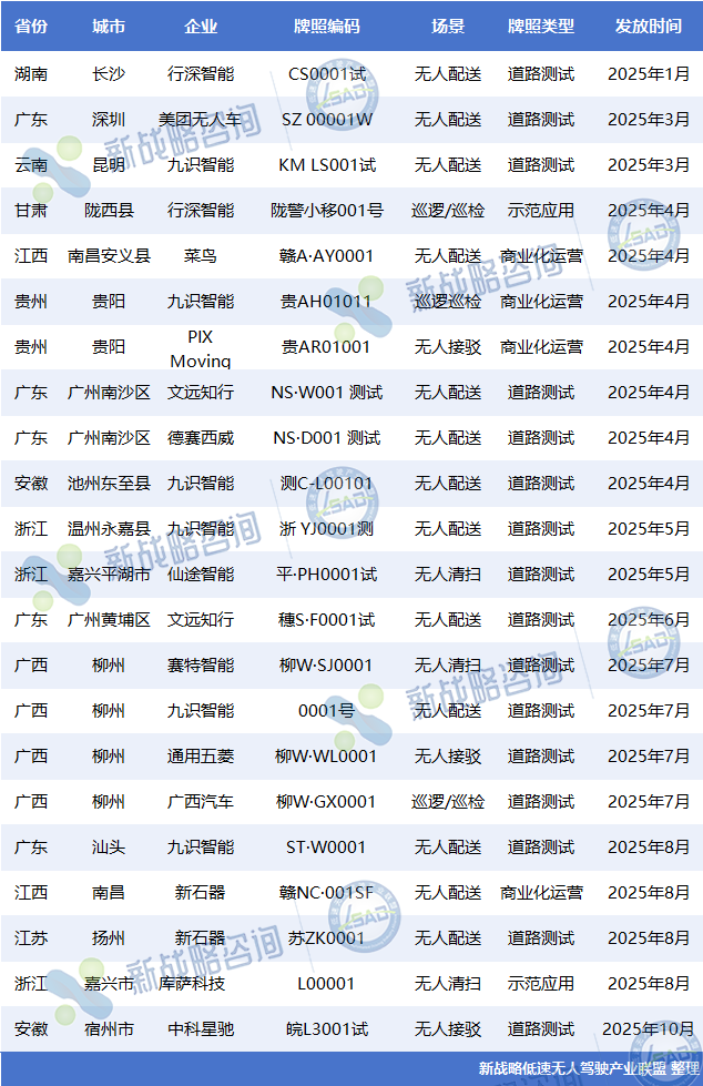 2025年以來低速無人車牌照發放情況(根據公開信息整理,未完善之處請指正!)