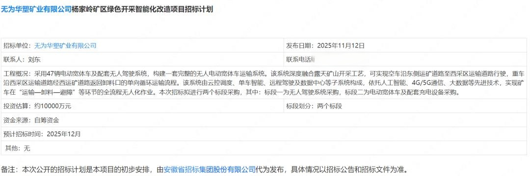新戰(zhàn)略低速無人駕駛全媒體獲悉,11月12日,無為華塑礦業(yè)有限公司發(fā)布楊家?guī)X礦區(qū)綠色開采智能化改造項目招標計劃,項目總預算為1億元,預計將于2025年12月正式開始招標。