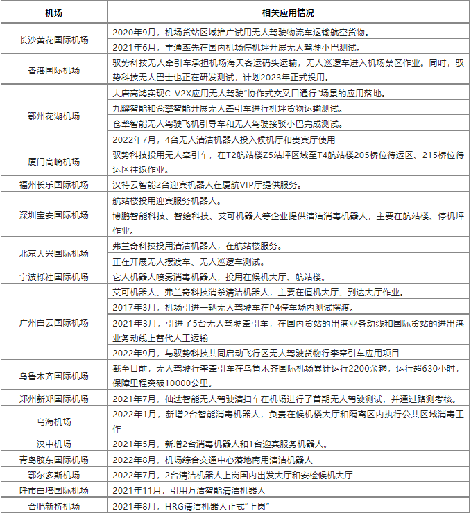 從國內部分機場無人駕駛應用情況來看,目前機場測試應用最多的無人駕駛車輛和設備主要為無人清掃車、迎賓機器人、消殺機器人、無人牽引車,無人巡邏車、無人接駁車、無人駕駛飛機引導車也在近年取得新的技術和應用突破。